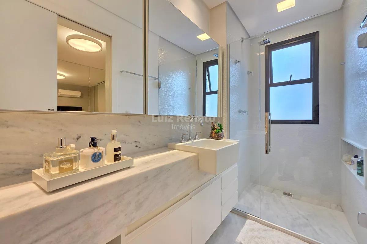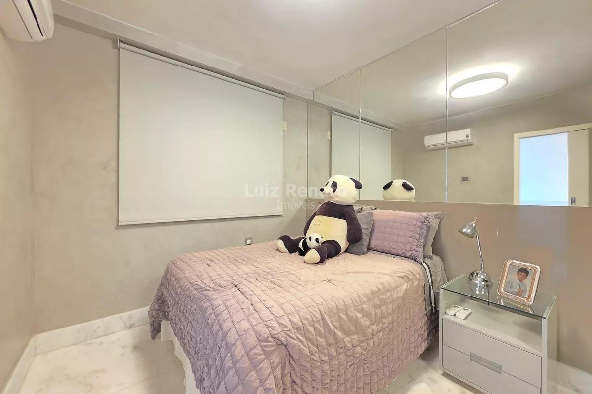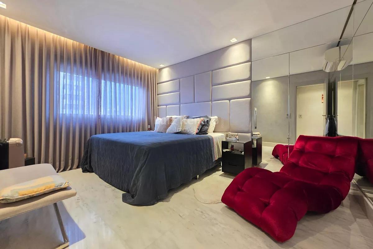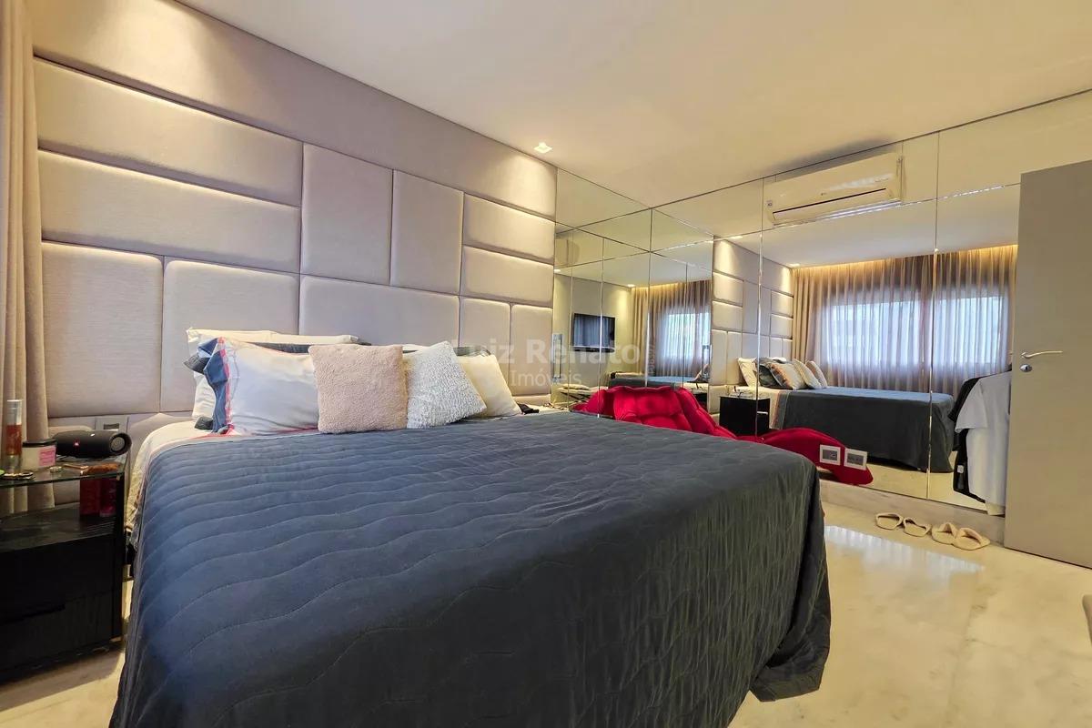 A planta original do imóvel é de quatro quartos, atualmente configurada com três suítes, sendo uma suíte máster com closet e duas suítes adicionais. Todos os quartos possuem armários planejados, piso em mármore, ar-condicionado e janelas com cortinas corrediças. Os banheiros das suítes são equipados com box em blindex transparente, armários planejados, piso e bancadas em mármore, cubas sobrepostas, sendo duas suítes com cubas duplas.