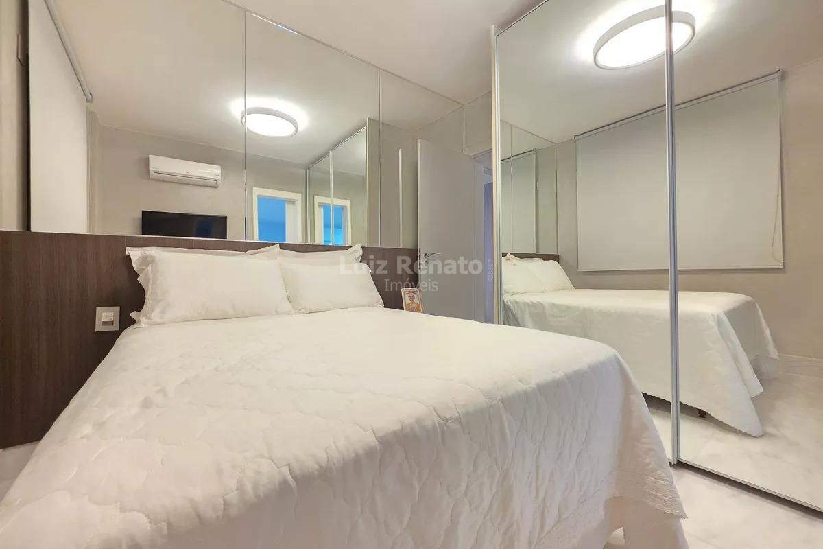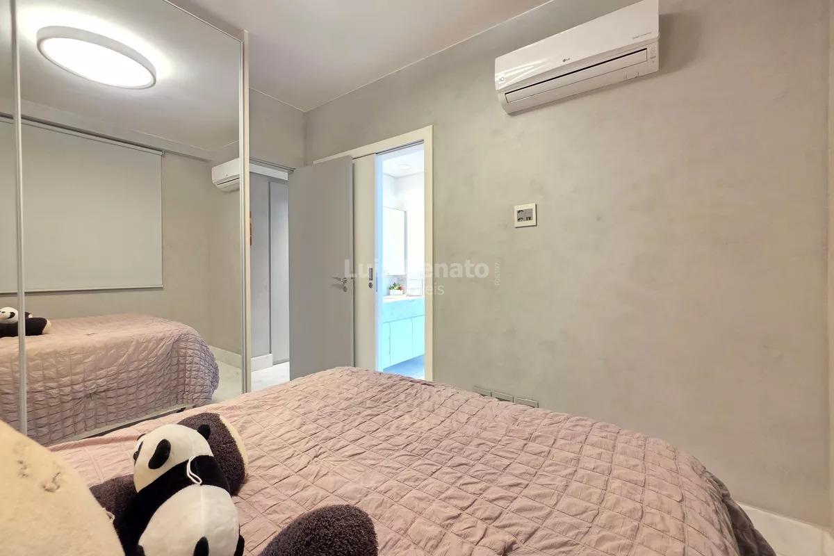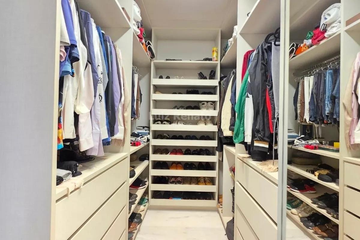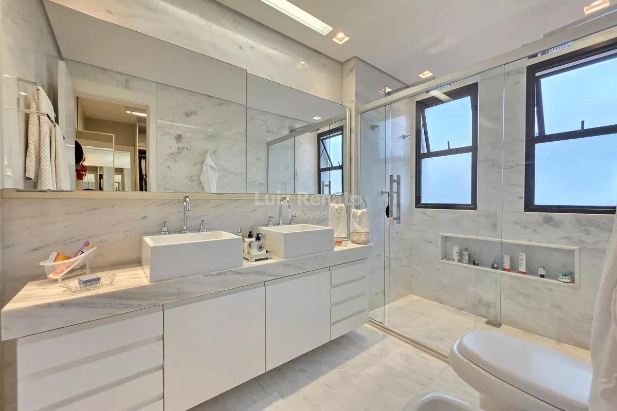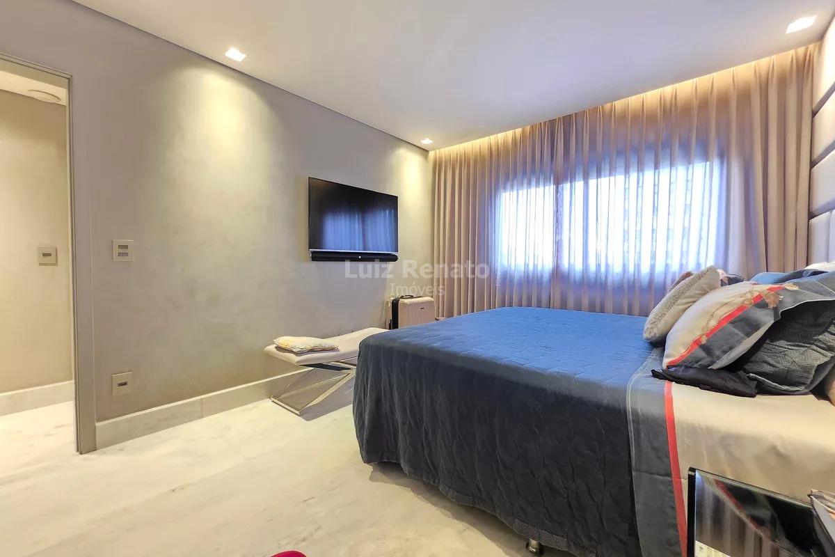 A planta original do imóvel é de quatro quartos, atualmente configurada com três suítes, sendo uma suíte máster com closet e duas suítes adicionais. Todos os quartos possuem armários planejados, piso em mármore, ar-condicionado e janelas com cortinas corrediças. Os banheiros das suítes são equipados com box em blindex transparente, armários planejados, piso e bancadas em mármore, cubas sobrepostas, sendo duas suítes com cubas duplas.