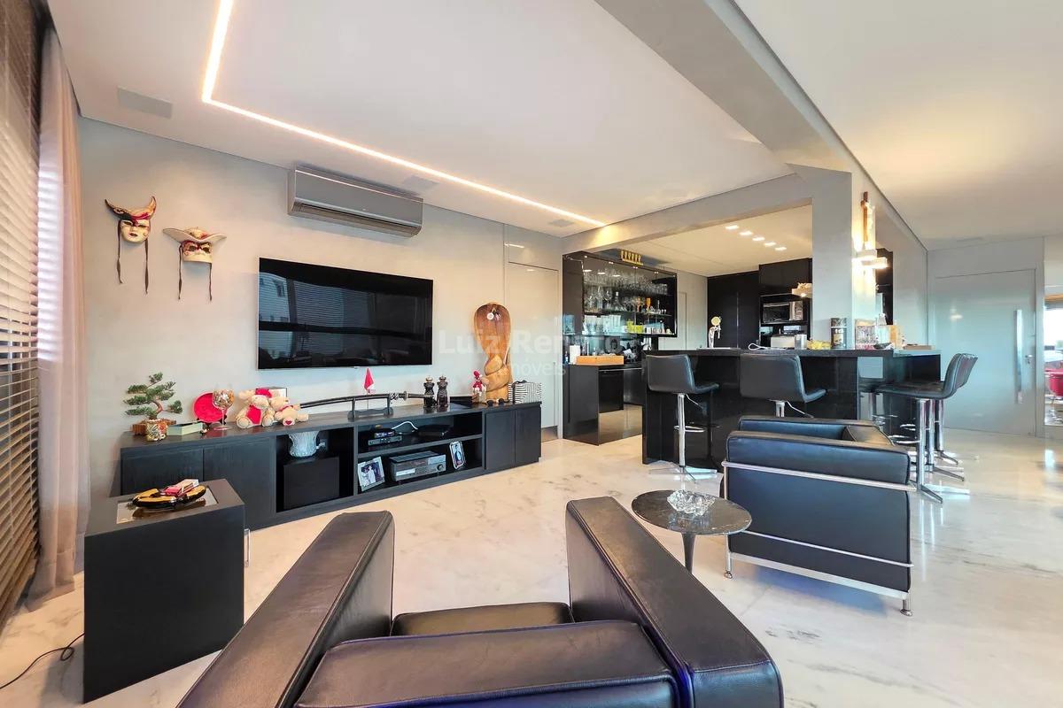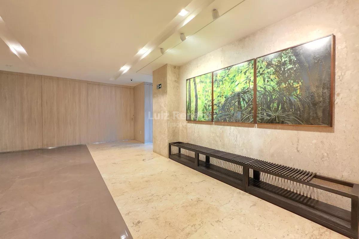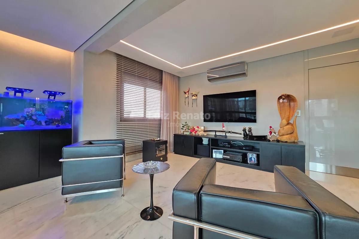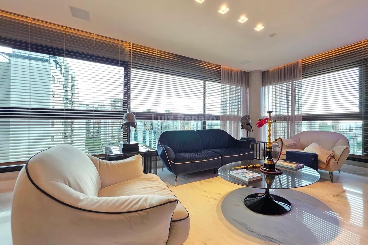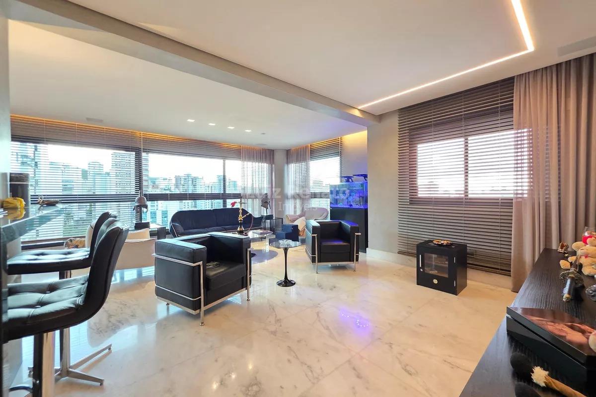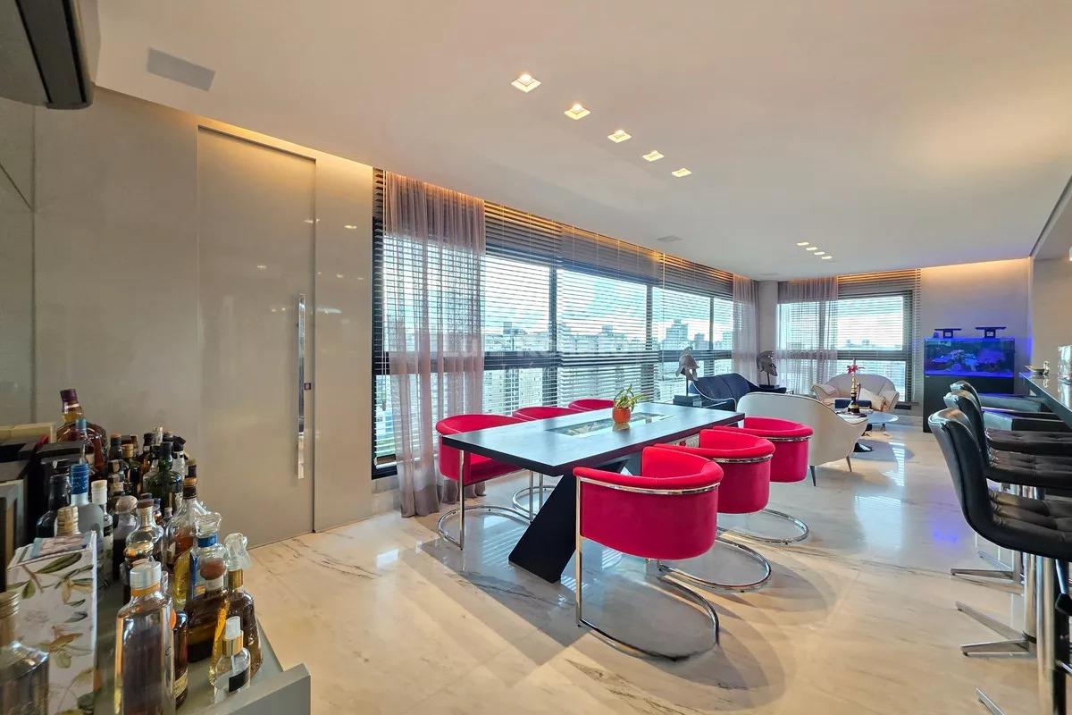 O apartamento possui uma sala ampla, com capacidade para múltiplos ambientes, piso em mármore, projeto de iluminação, marcenaria planejada com acabamento laqueado, cortinas com fechamento eletrônico e janelas panorâmicas que garantem excelente iluminação natural. Conta ainda com lavabo com bancada em mármore e cuba em pedra esculpida.