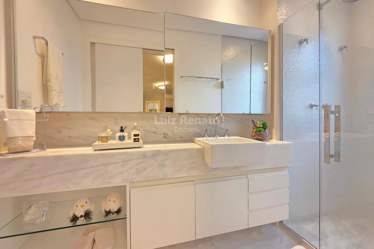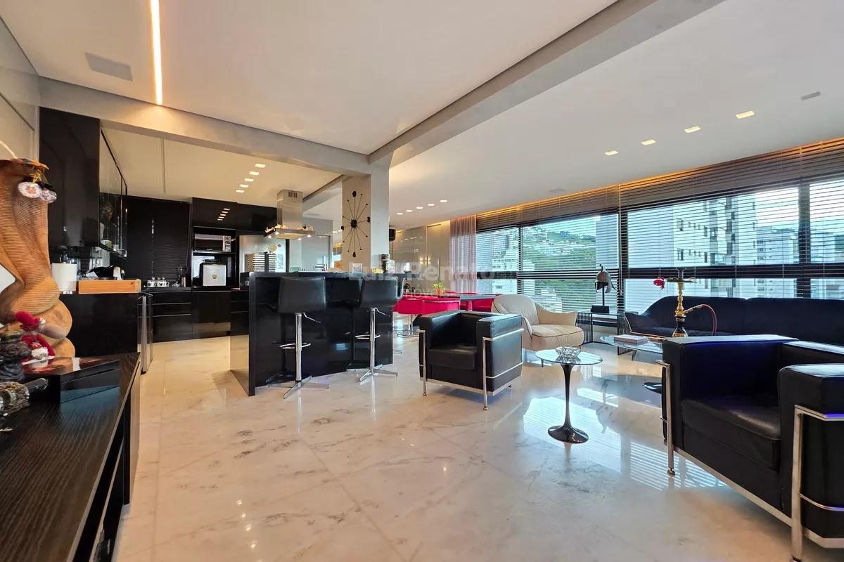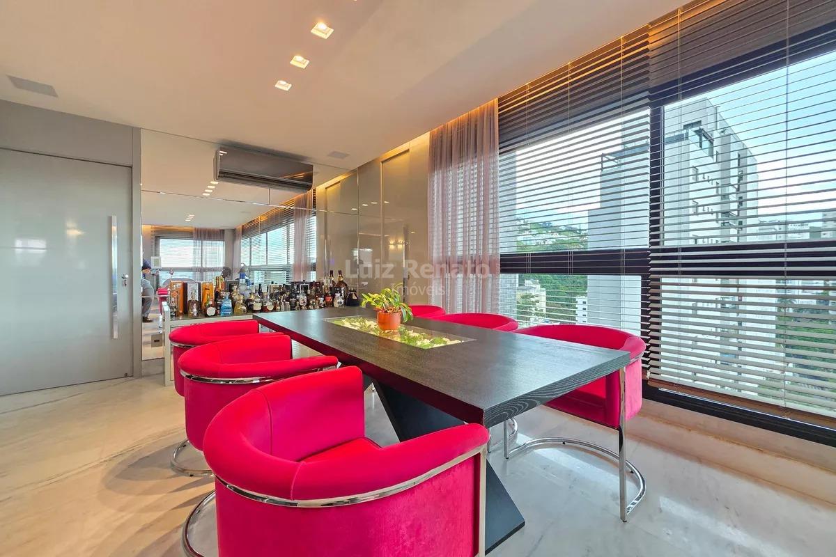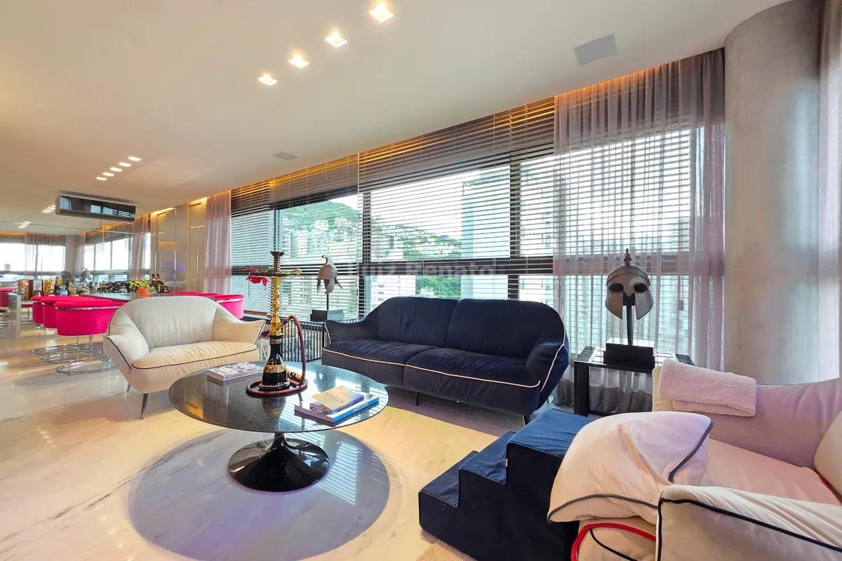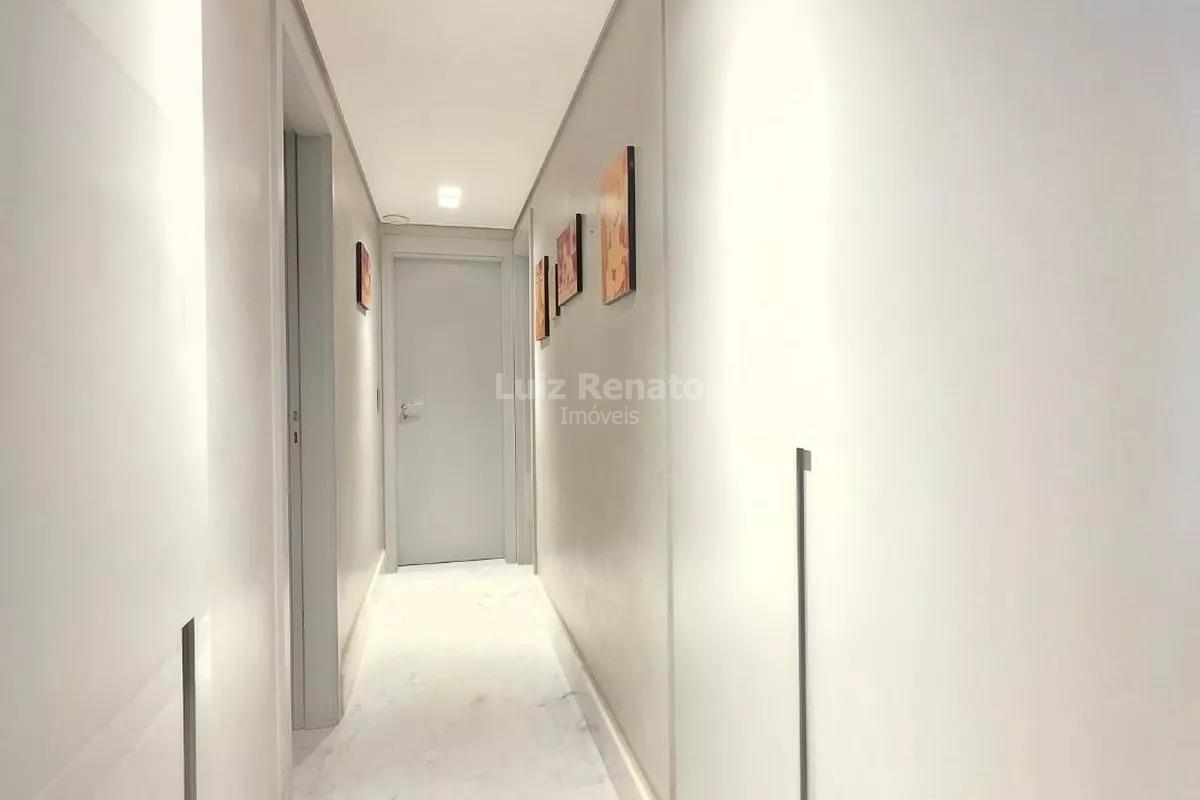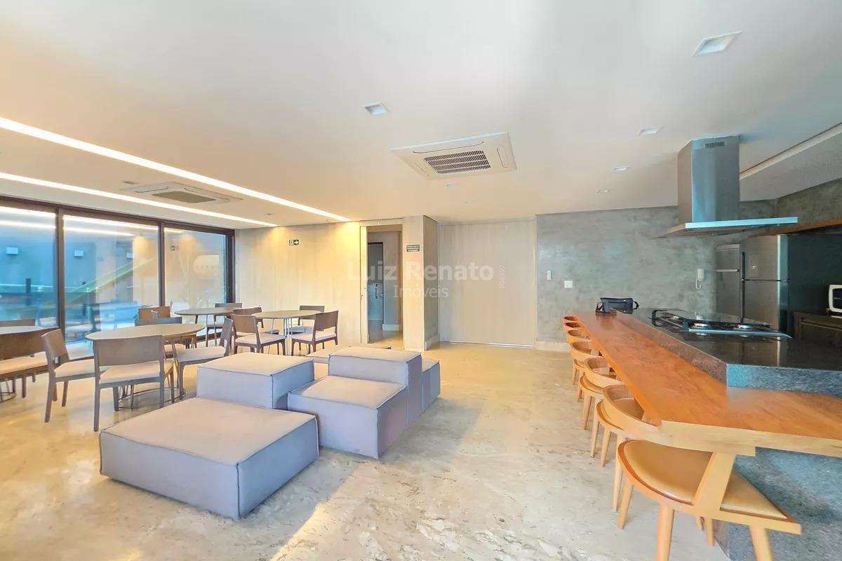 O apartamento possui uma sala ampla, com capacidade para múltiplos ambientes, piso em mármore, projeto de iluminação, marcenaria planejada com acabamento laqueado, cortinas com fechamento eletrônico e janelas panorâmicas que garantem excelente iluminação natural. Conta ainda com lavabo com bancada em mármore e cuba em pedra esculpida.