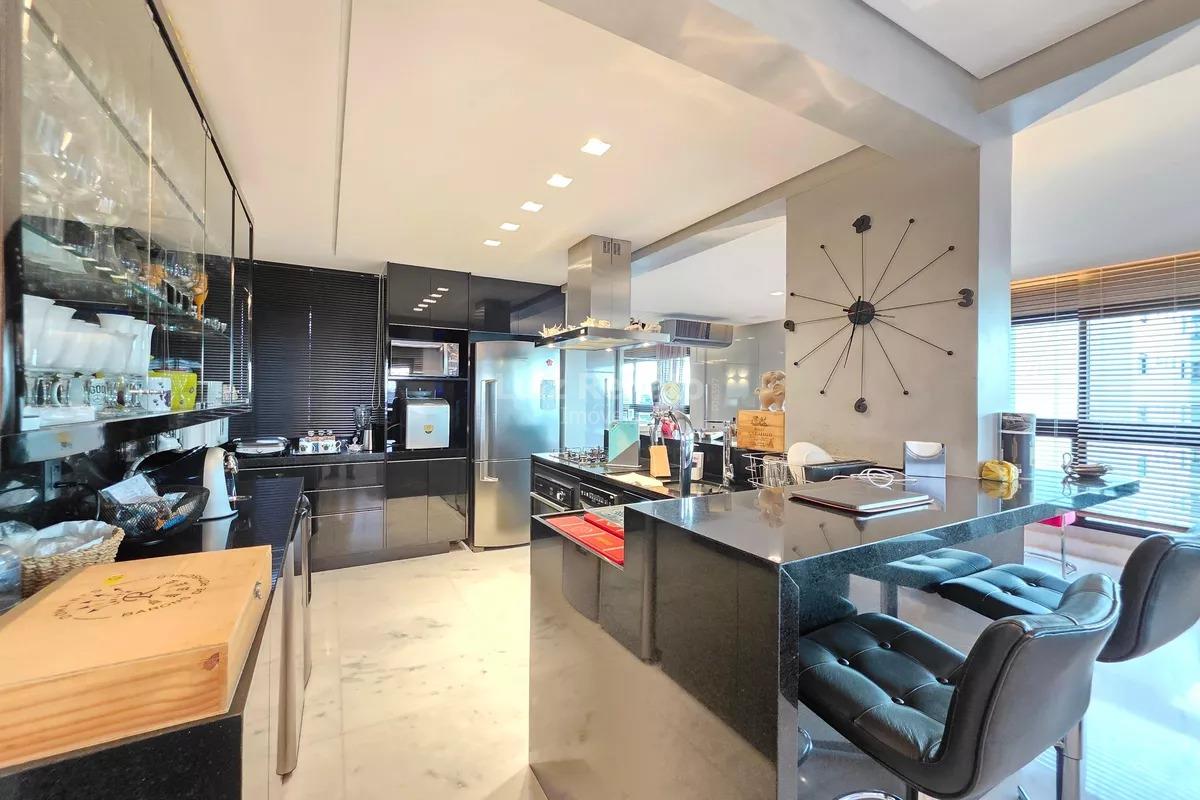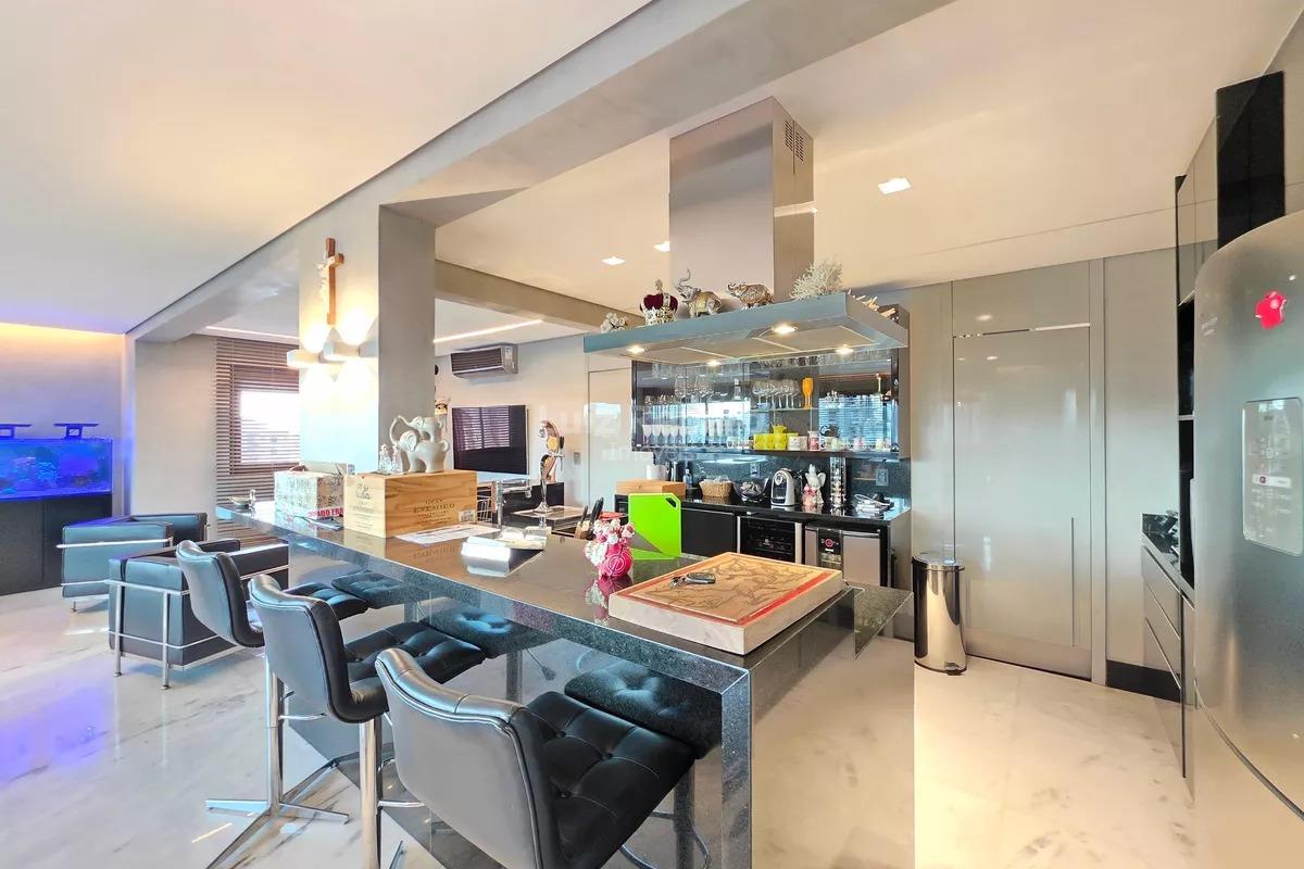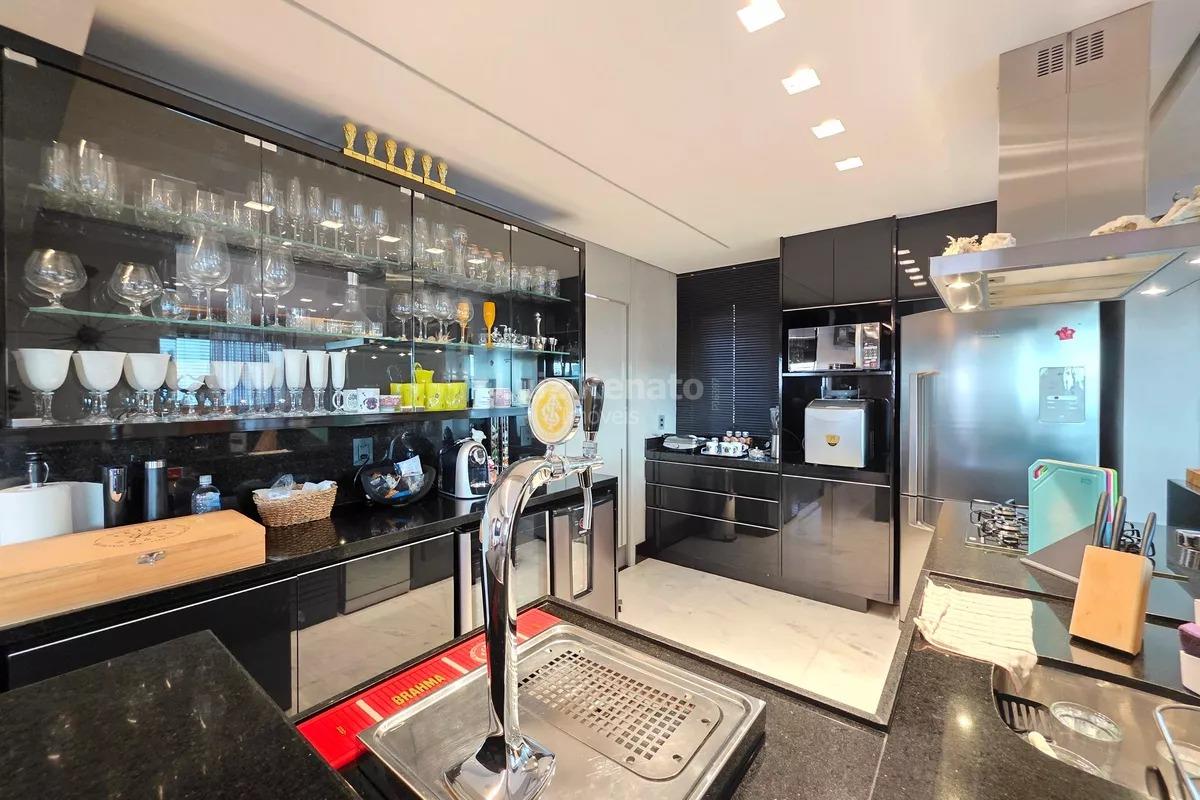 A cozinha é americana, com piso em mármore, bancadas em granito, armários planejados, depurador de ar e chopeira. O imóvel conta ainda com quarto de serviço e banheiro de serviço, oferecendo funcionalidade e conforto no dia a dia.