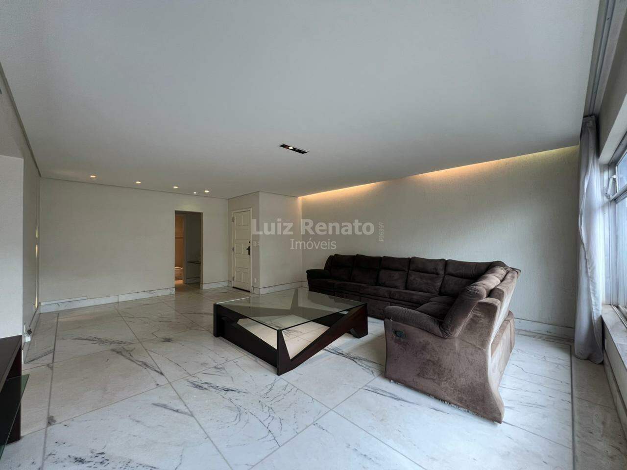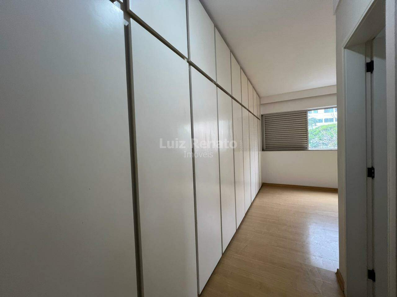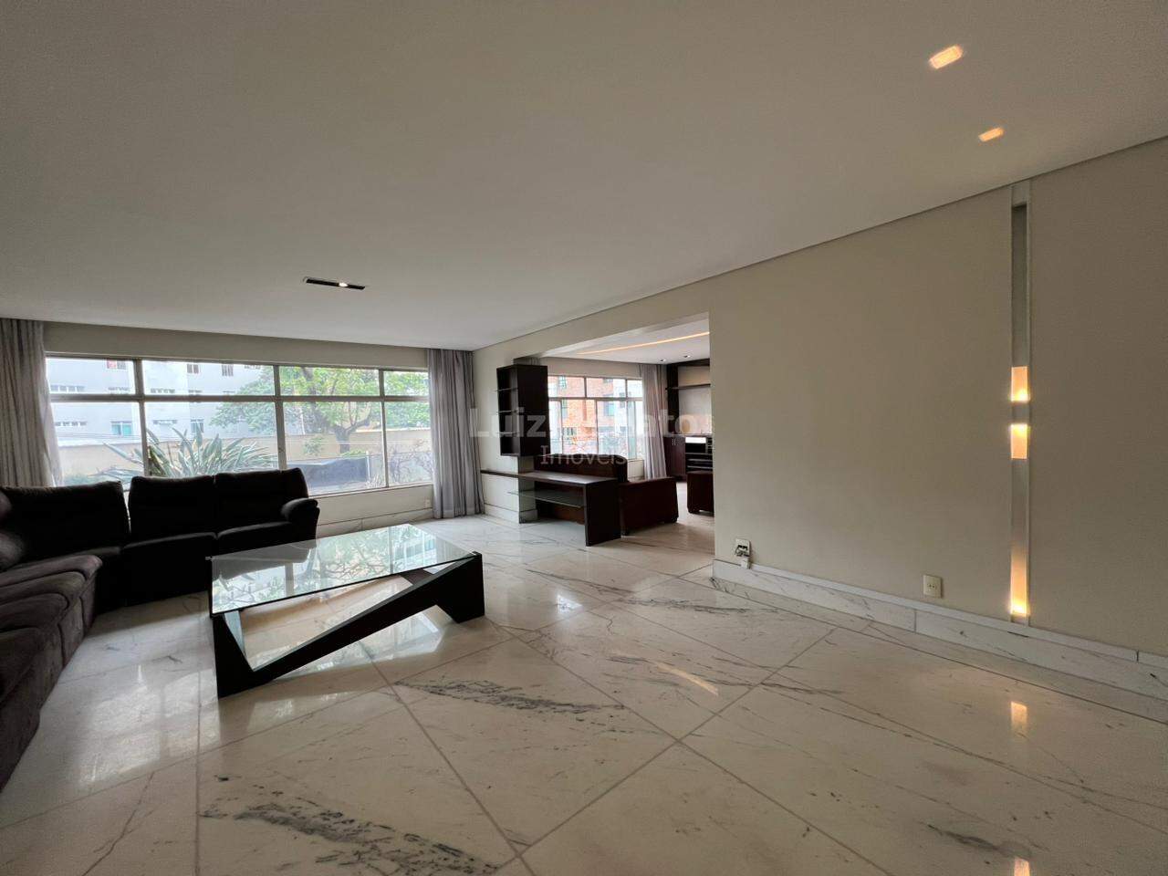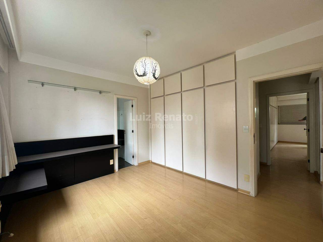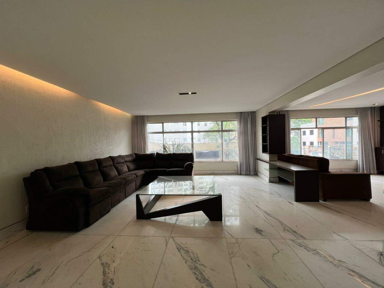 Apartamento para locação no bairro Serra, com 244 m² muito bem distribuídos. Possui sala ampla para três ambientes, com piso em mármore, lavabo, escritório e rouparia no corredor. São quatro quartos com armários e piso em laminado, sendo duas suítes. O banheiro social conta com bancadas, armários, box e espelhos.