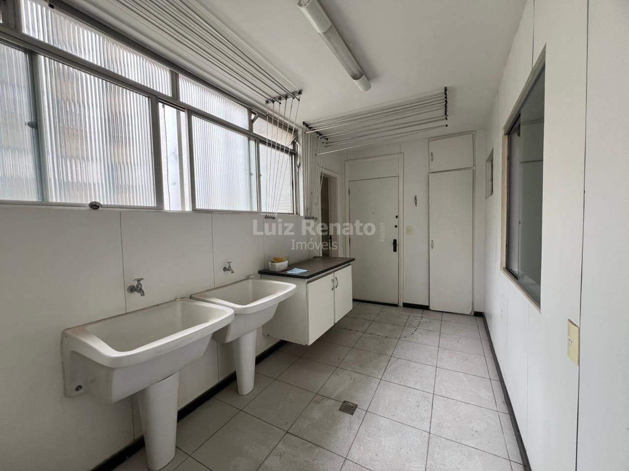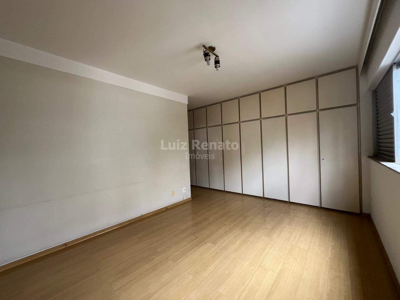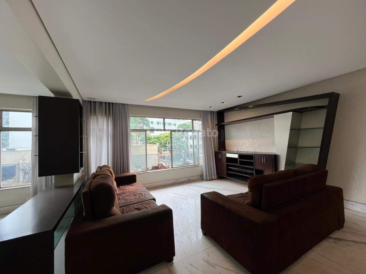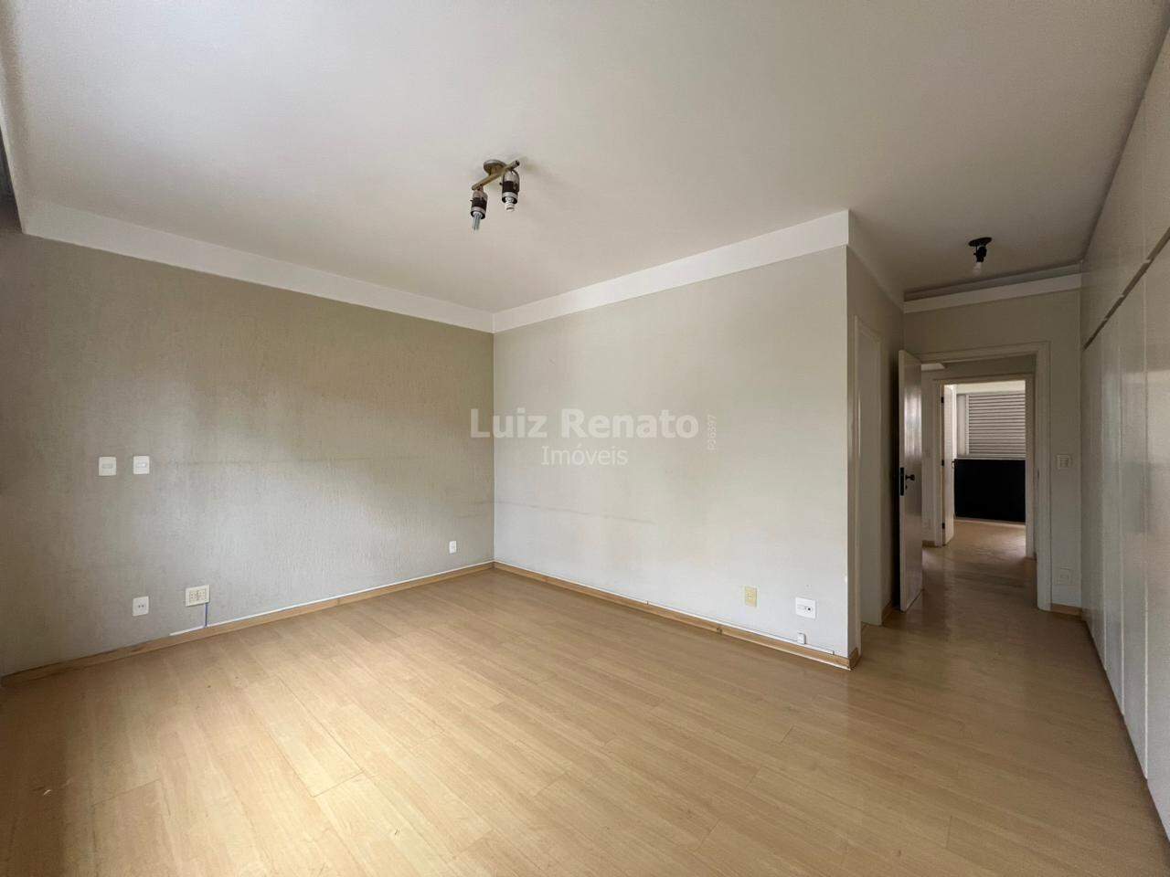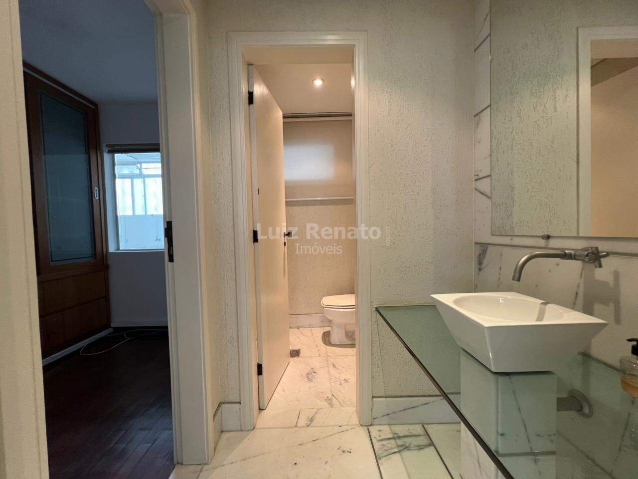 Apartamento para locação no bairro Serra, com 244 m² muito bem distribuídos. Possui sala ampla para três ambientes, com piso em mármore, lavabo, escritório e rouparia no corredor. São quatro quartos com armários e piso em laminado, sendo duas suítes. O banheiro social conta com bancadas, armários, box e espelhos.