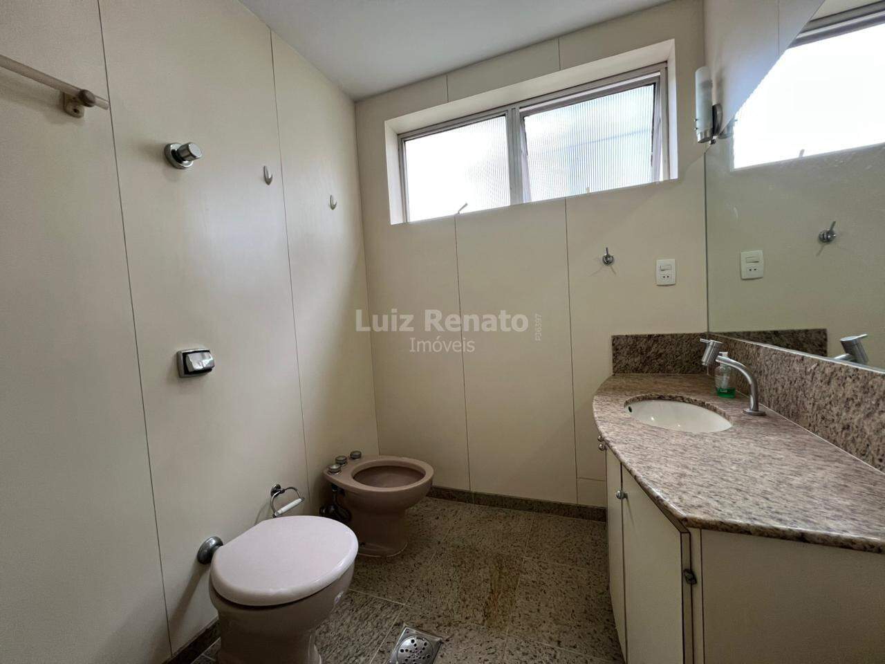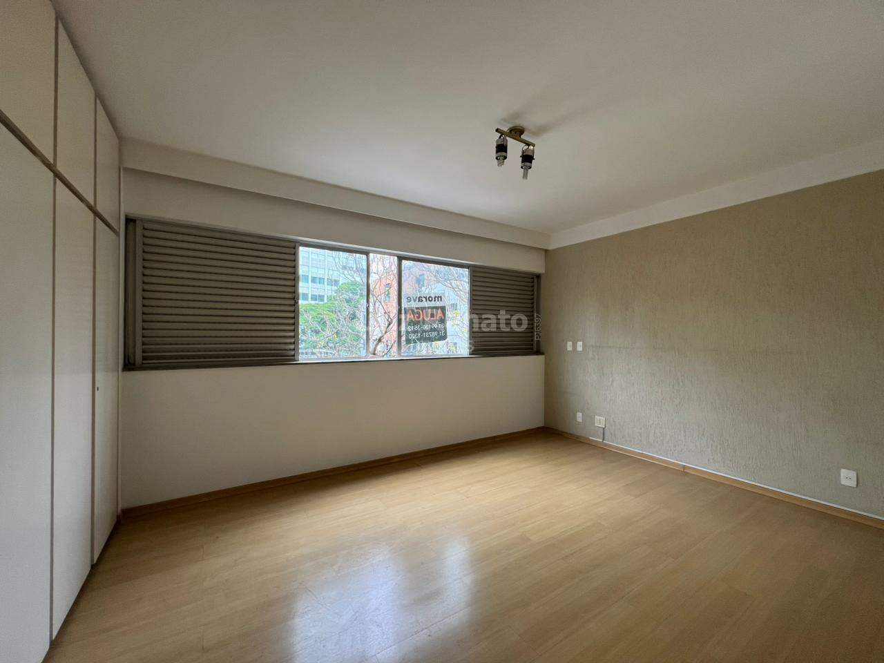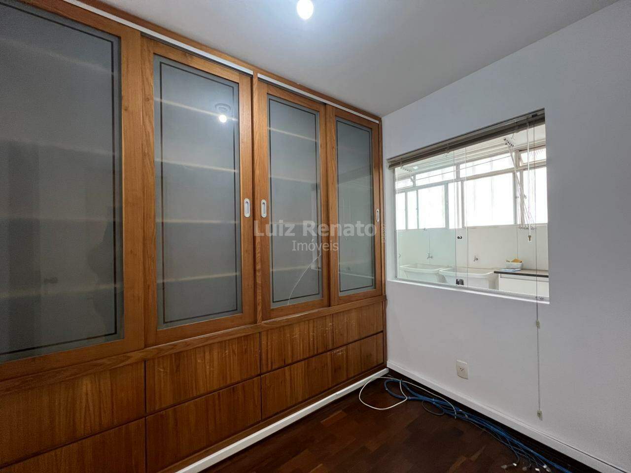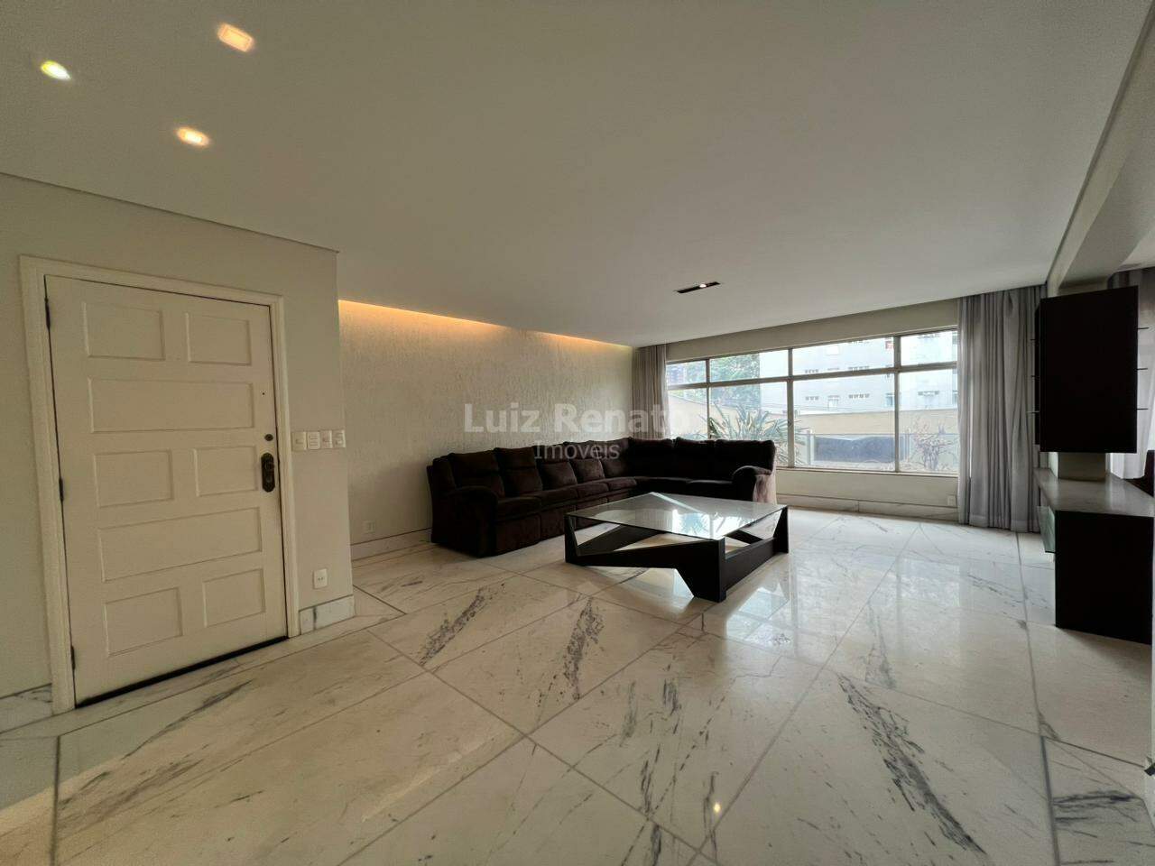 Apartamento para locação no bairro Serra, com 244 m² muito bem distribuídos. Possui sala ampla para três ambientes, com piso em mármore, lavabo, escritório e rouparia no corredor. São quatro quartos com armários e piso em laminado, sendo duas suítes. O banheiro social conta com bancadas, armários, box e espelhos.