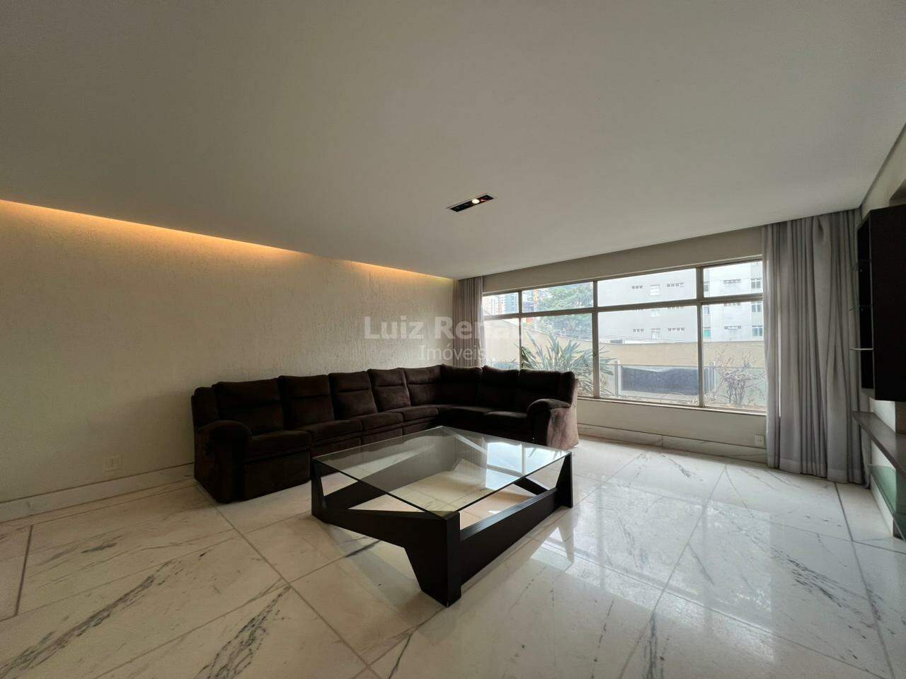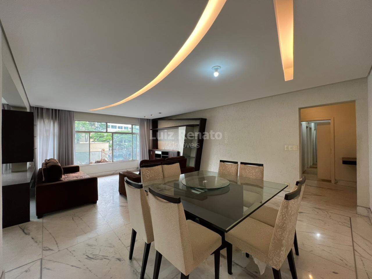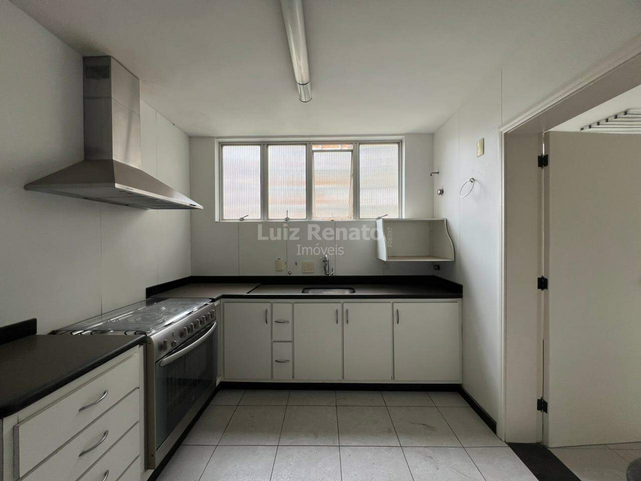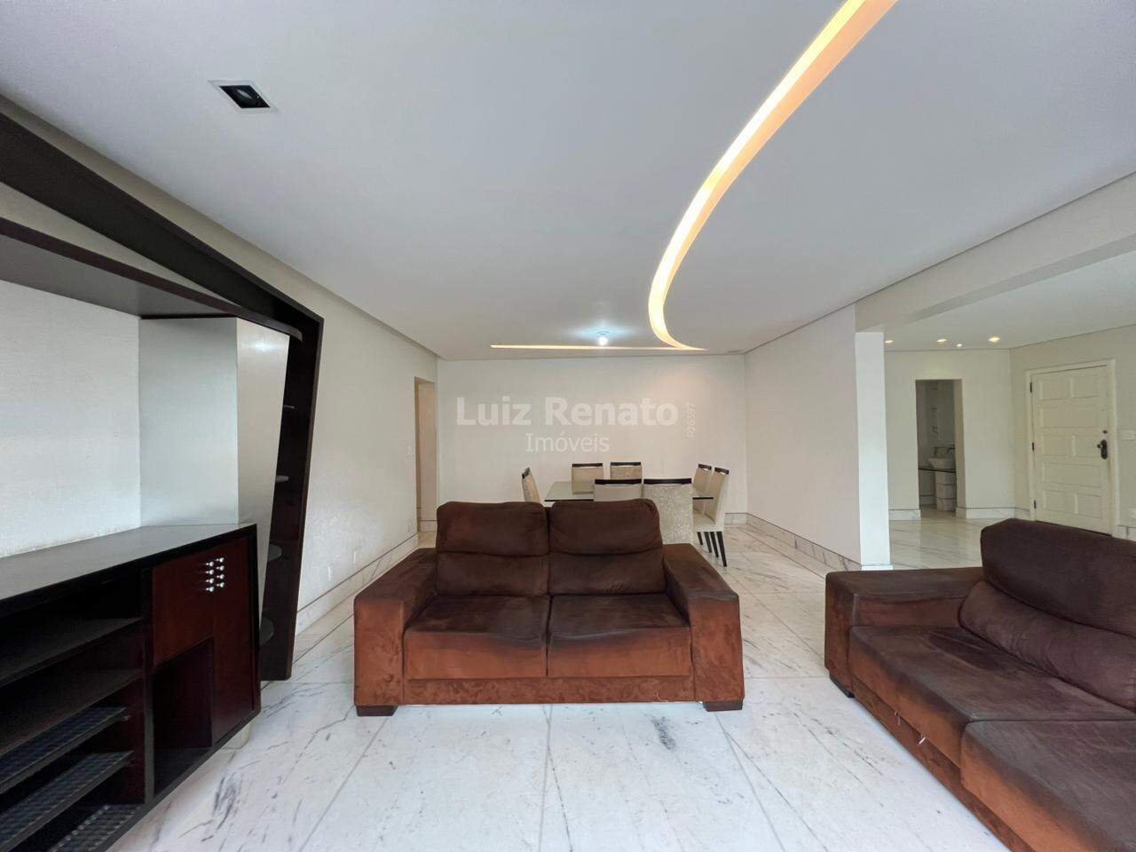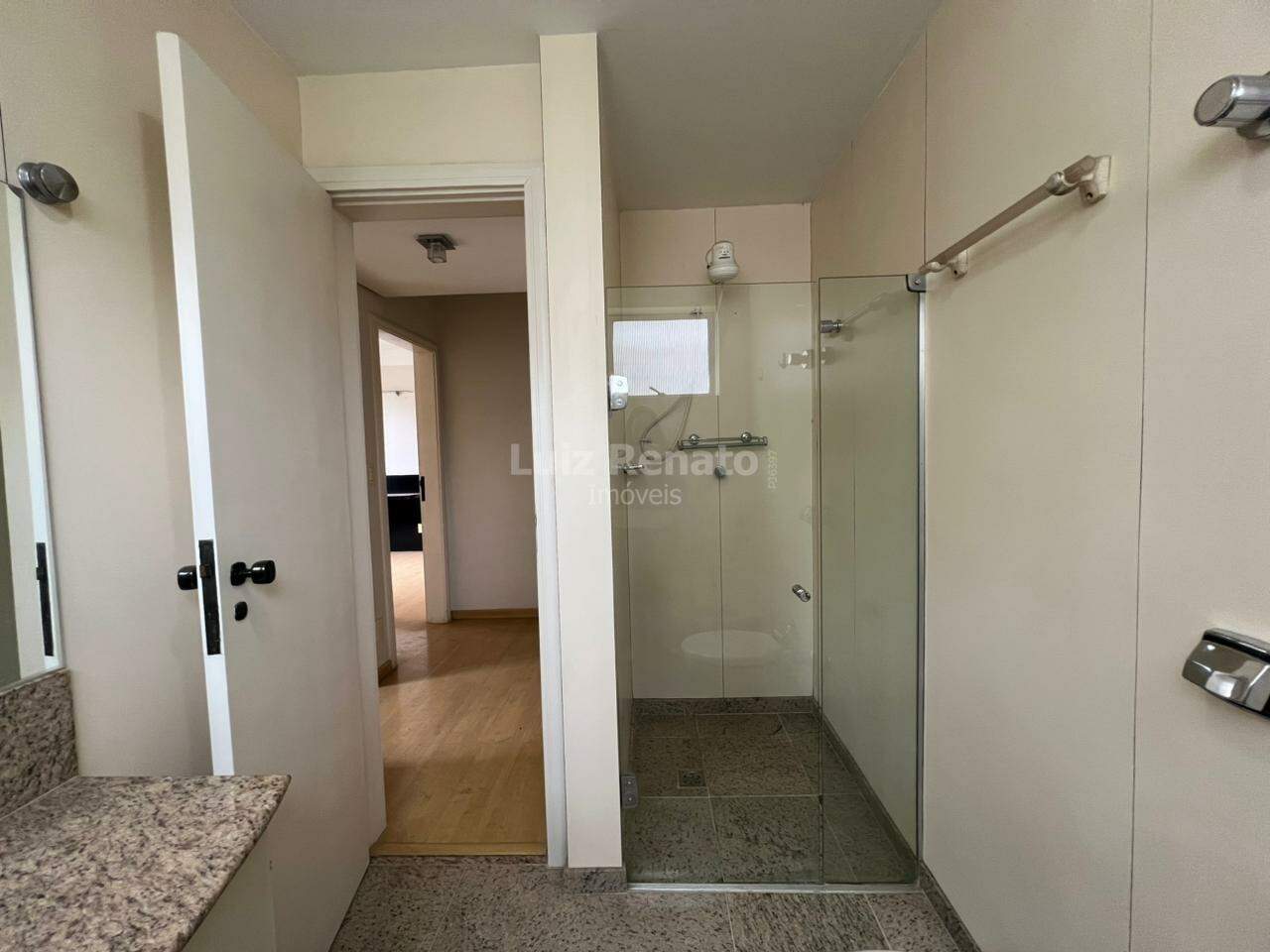 Apartamento para locação no bairro Serra, com 244 m² muito bem distribuídos. Possui sala ampla para três ambientes, com piso em mármore, lavabo, escritório e rouparia no corredor. São quatro quartos com armários e piso em laminado, sendo duas suítes. O banheiro social conta com bancadas, armários, box e espelhos.