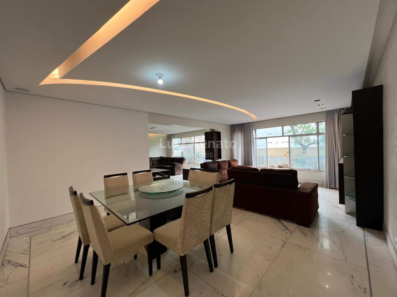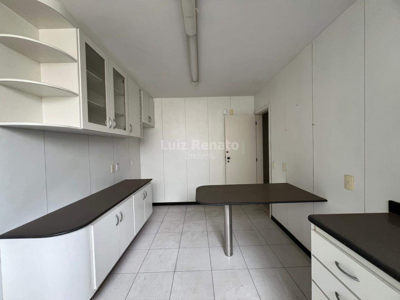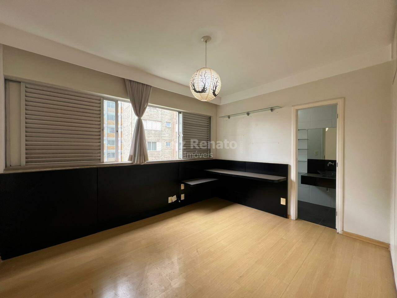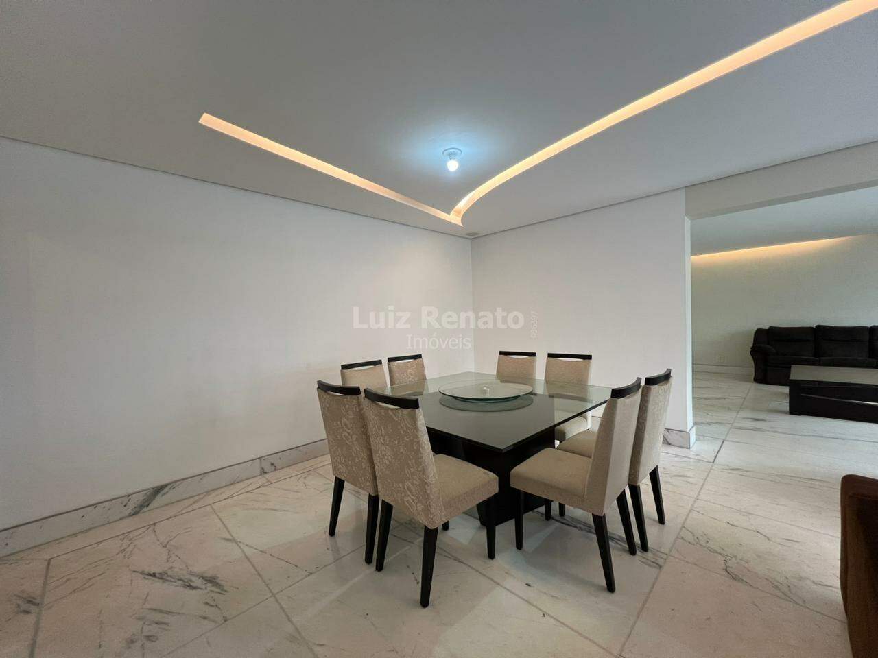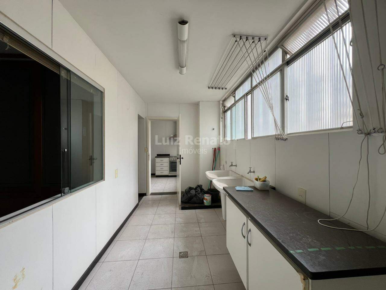 Apartamento para locação no bairro Serra, com 244 m² muito bem distribuídos. Possui sala ampla para três ambientes, com piso em mármore, lavabo, escritório e rouparia no corredor. São quatro quartos com armários e piso em laminado, sendo duas suítes. O banheiro social conta com bancadas, armários, box e espelhos.