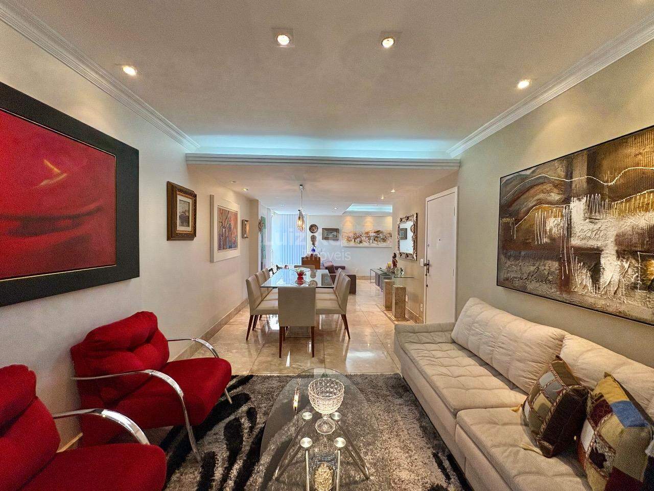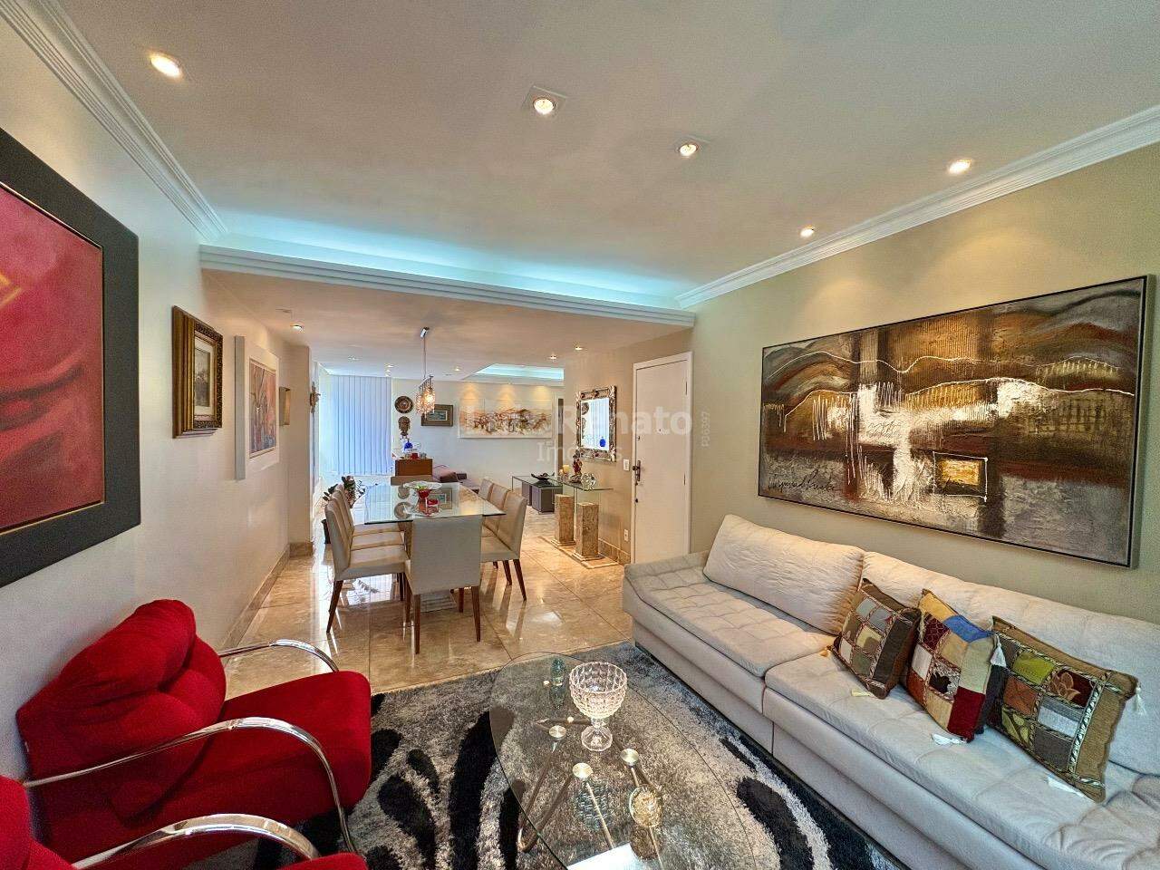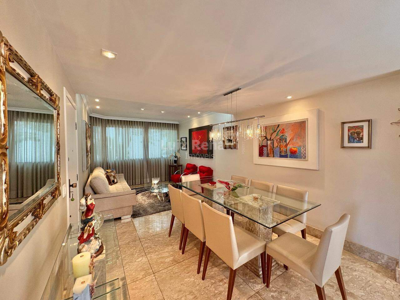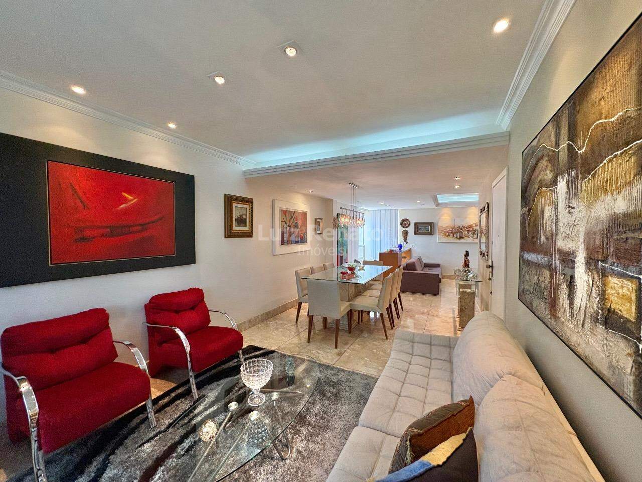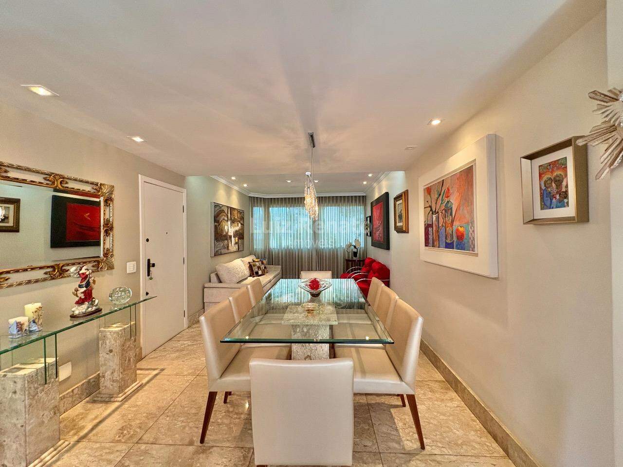 Apartamento: 140 m², sala ampla com piso em mármore, com varanda incorporada, 04 quartos com armários, sendo 1 suíte, banho social (com box, armários), rouparia, cozinha ampla com armários planejados, área de serviço e DCE.