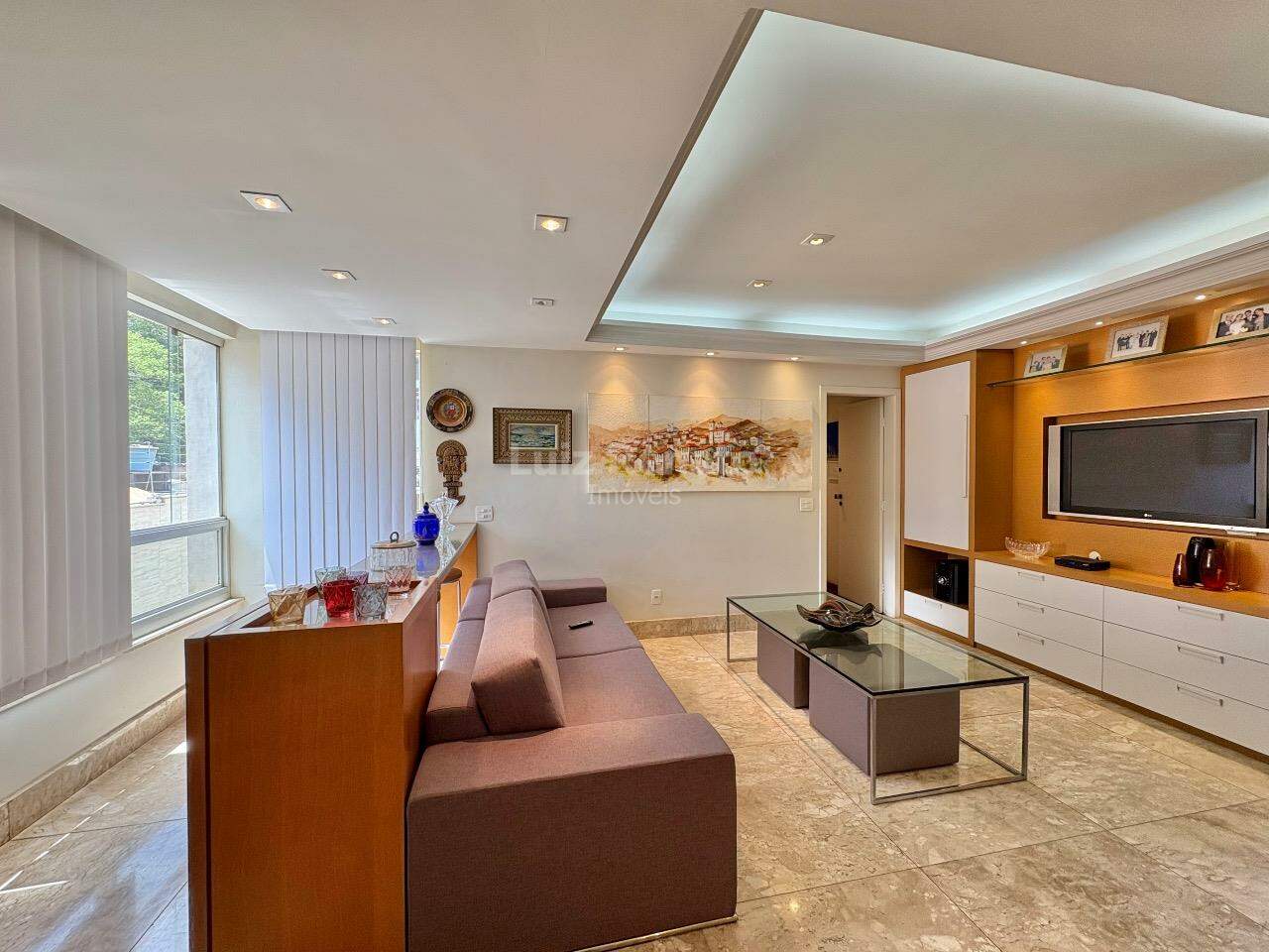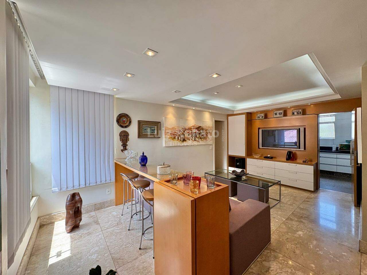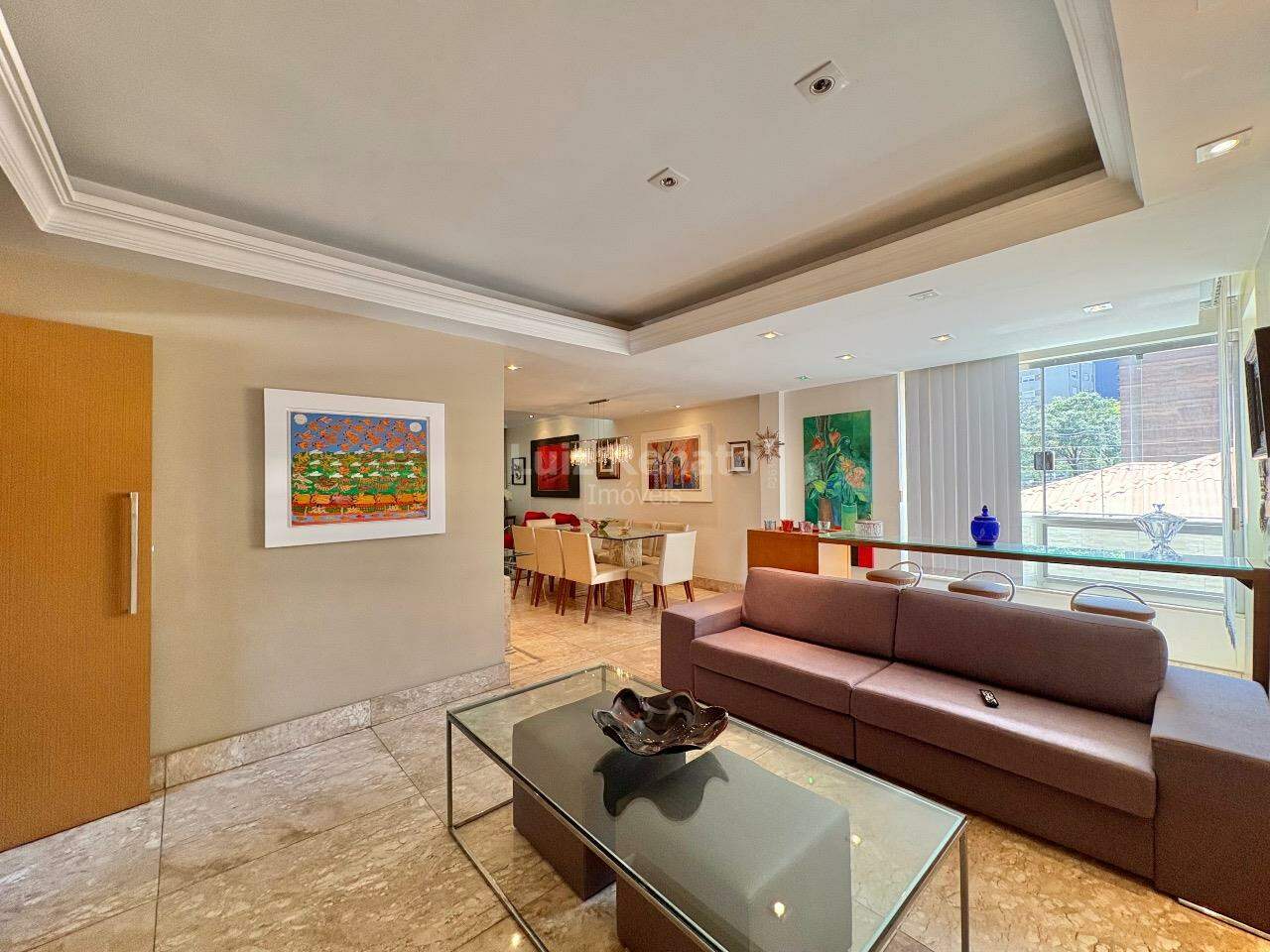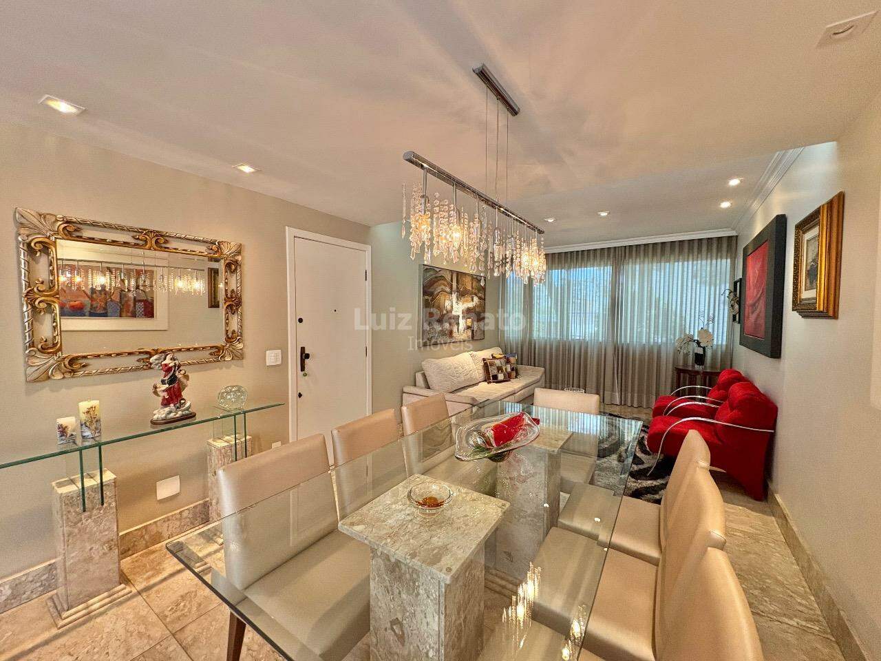 Apartamento: 140 m², sala ampla com piso em mármore, com varanda incorporada, 04 quartos com armários, sendo 1 suíte, banho social (com box, armários), rouparia, cozinha ampla com armários planejados, área de serviço e DCE.