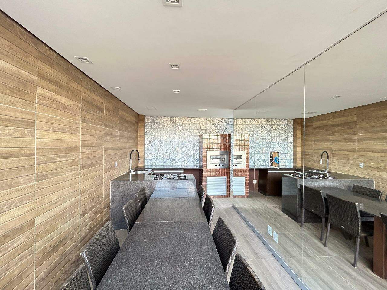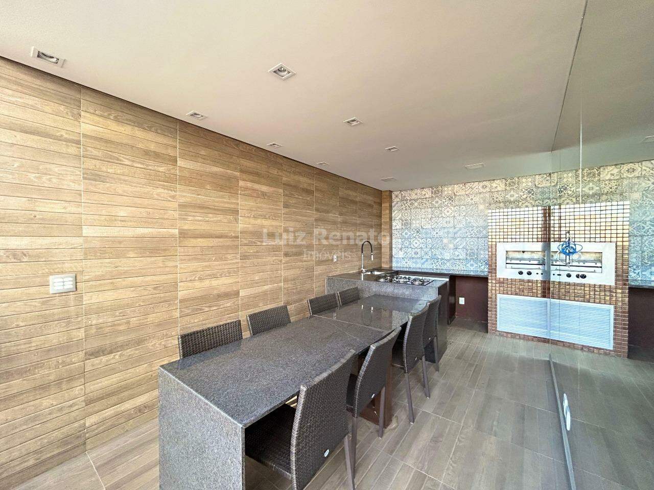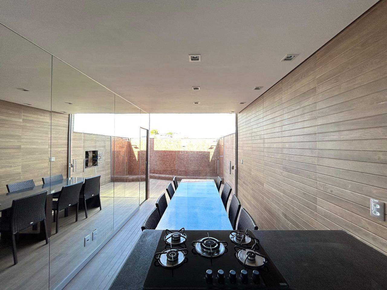 Ampla área externa em U com espaço gourmet coberto montado com churrasqueira elétrica, fogão cooktop, mesa de jantar, bancadas em granito, armários planejados, espelho e lavabo, ducha.