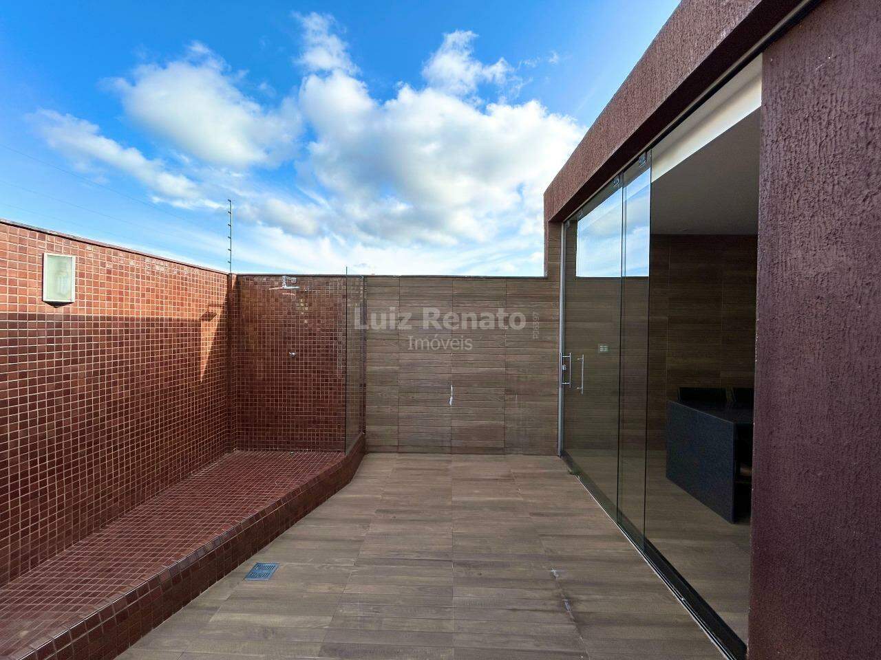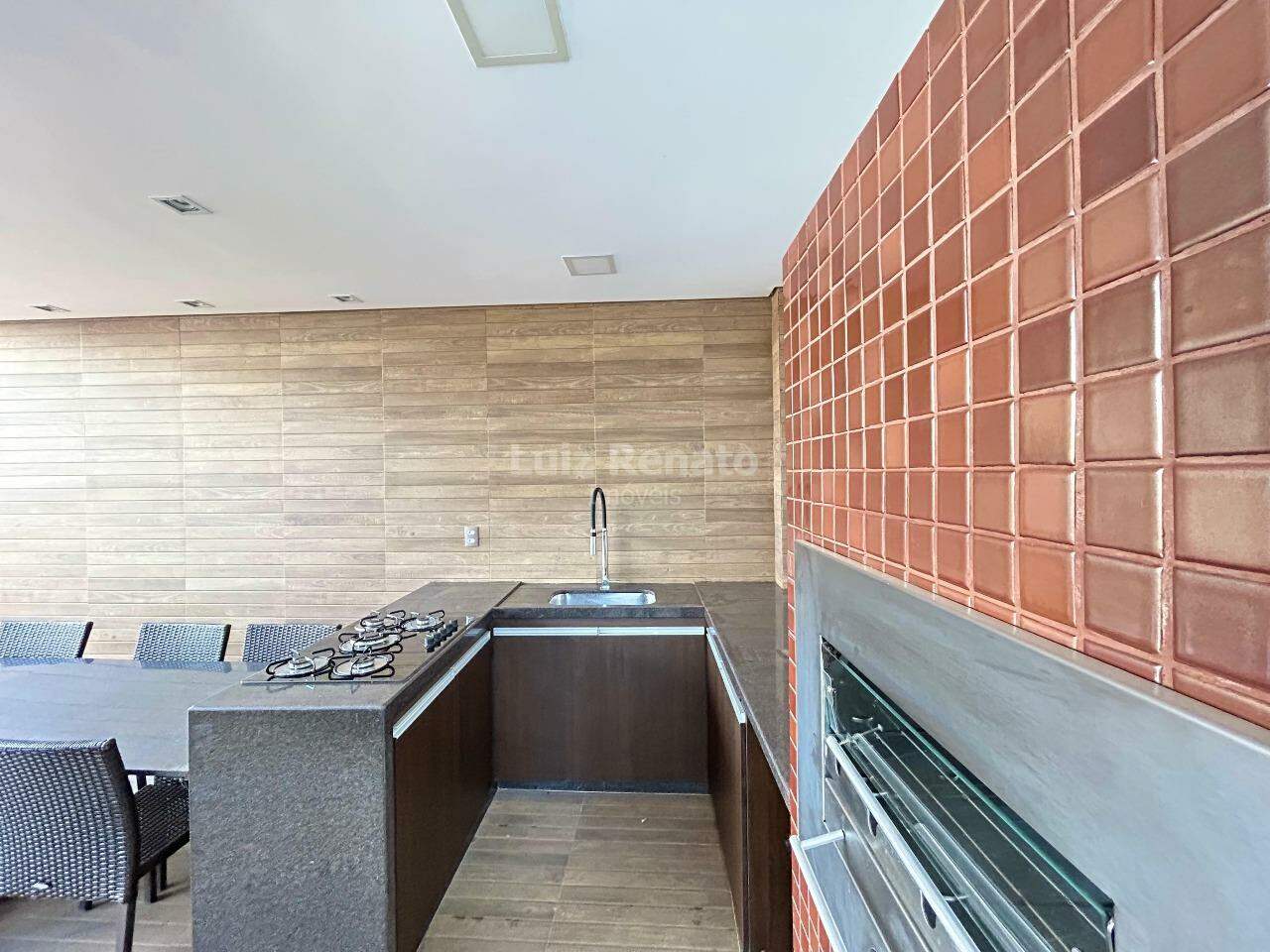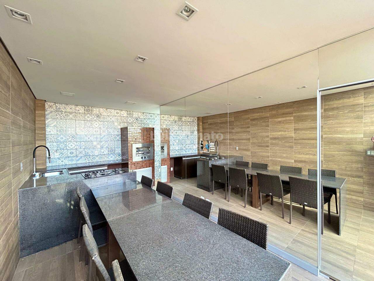 Ampla área externa em U com espaço gourmet coberto montado com churrasqueira elétrica, fogão cooktop, mesa de jantar, bancadas em granito, armários planejados, espelho e lavabo, ducha.