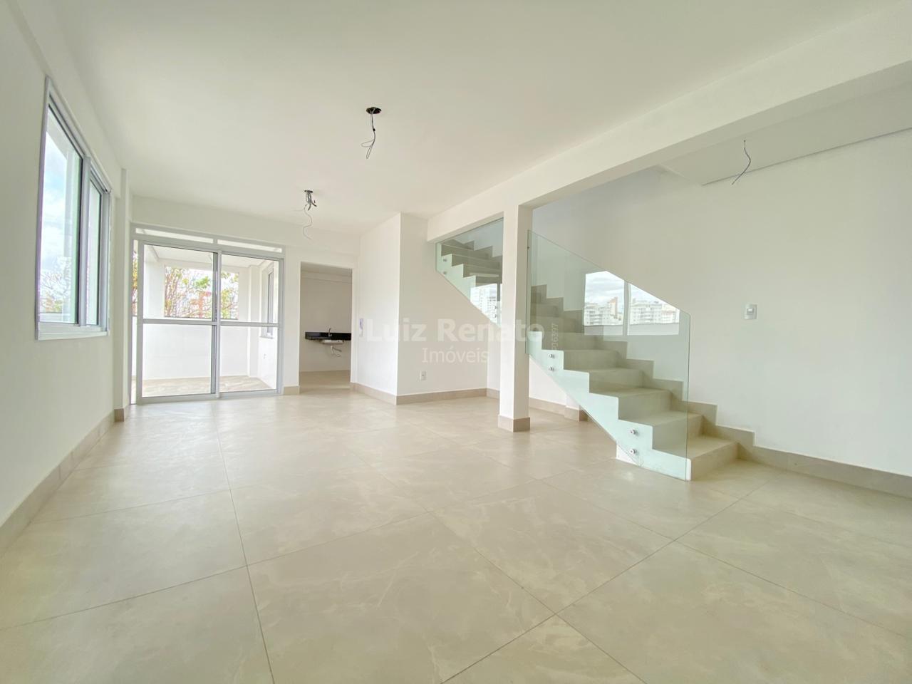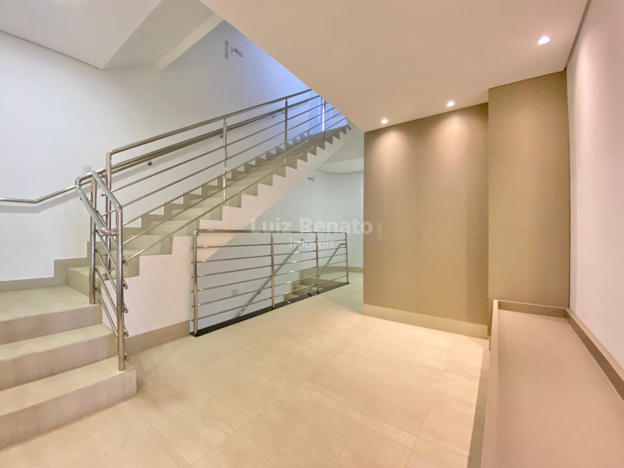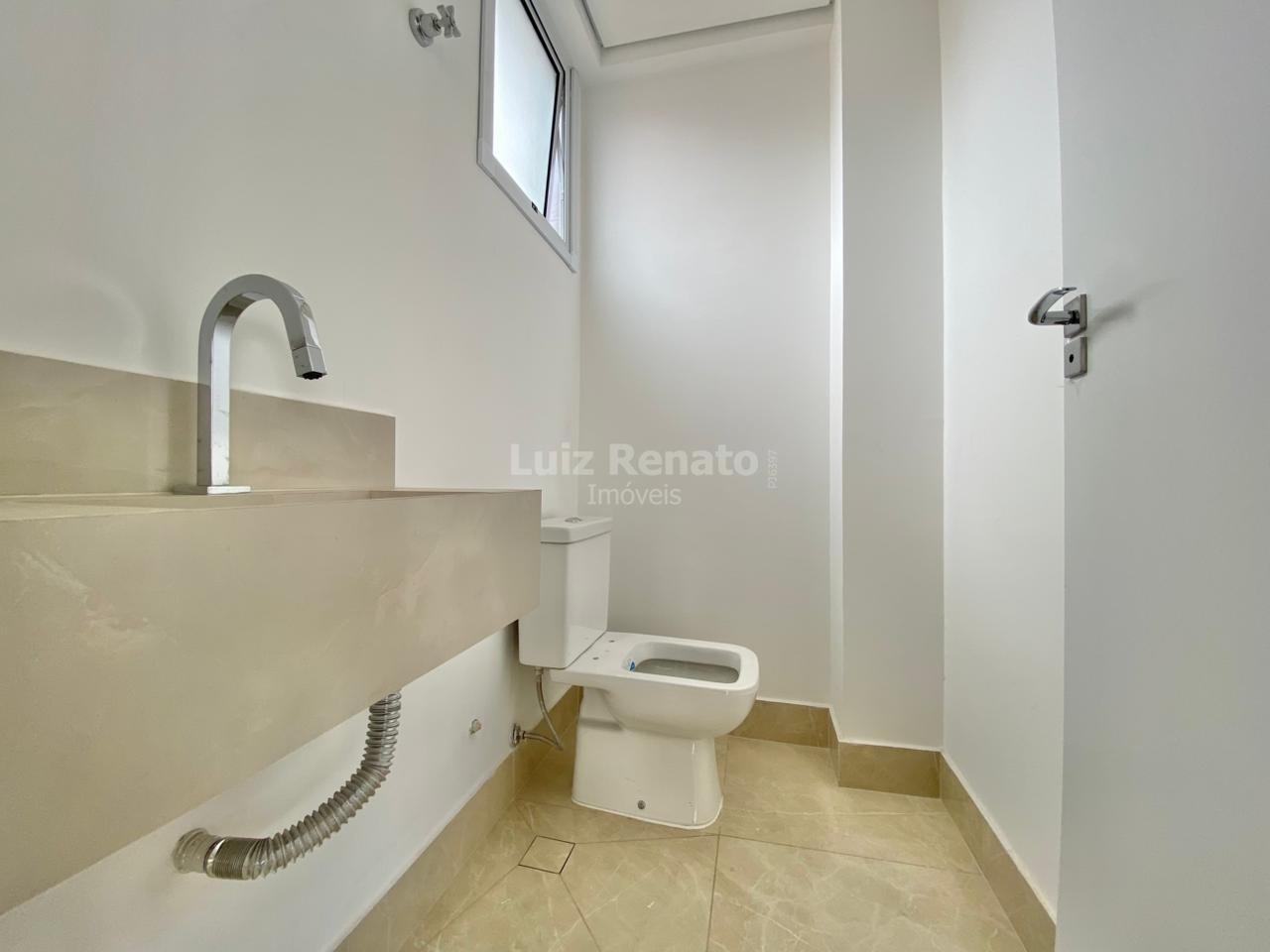 Cobertura top house sendo no primeiro pavimento uma sala para dois ambientes com piso em porcelanato e lavabo.