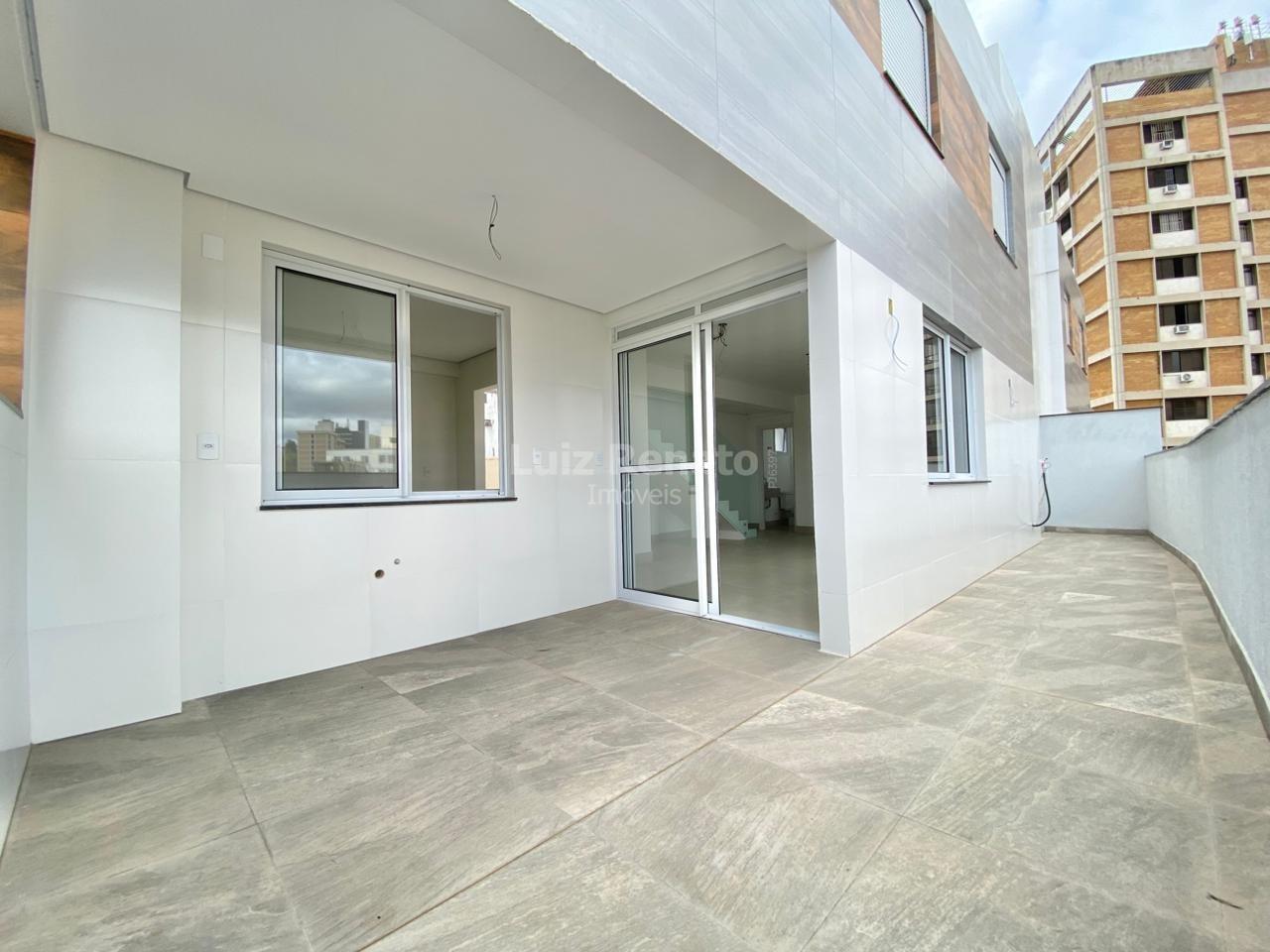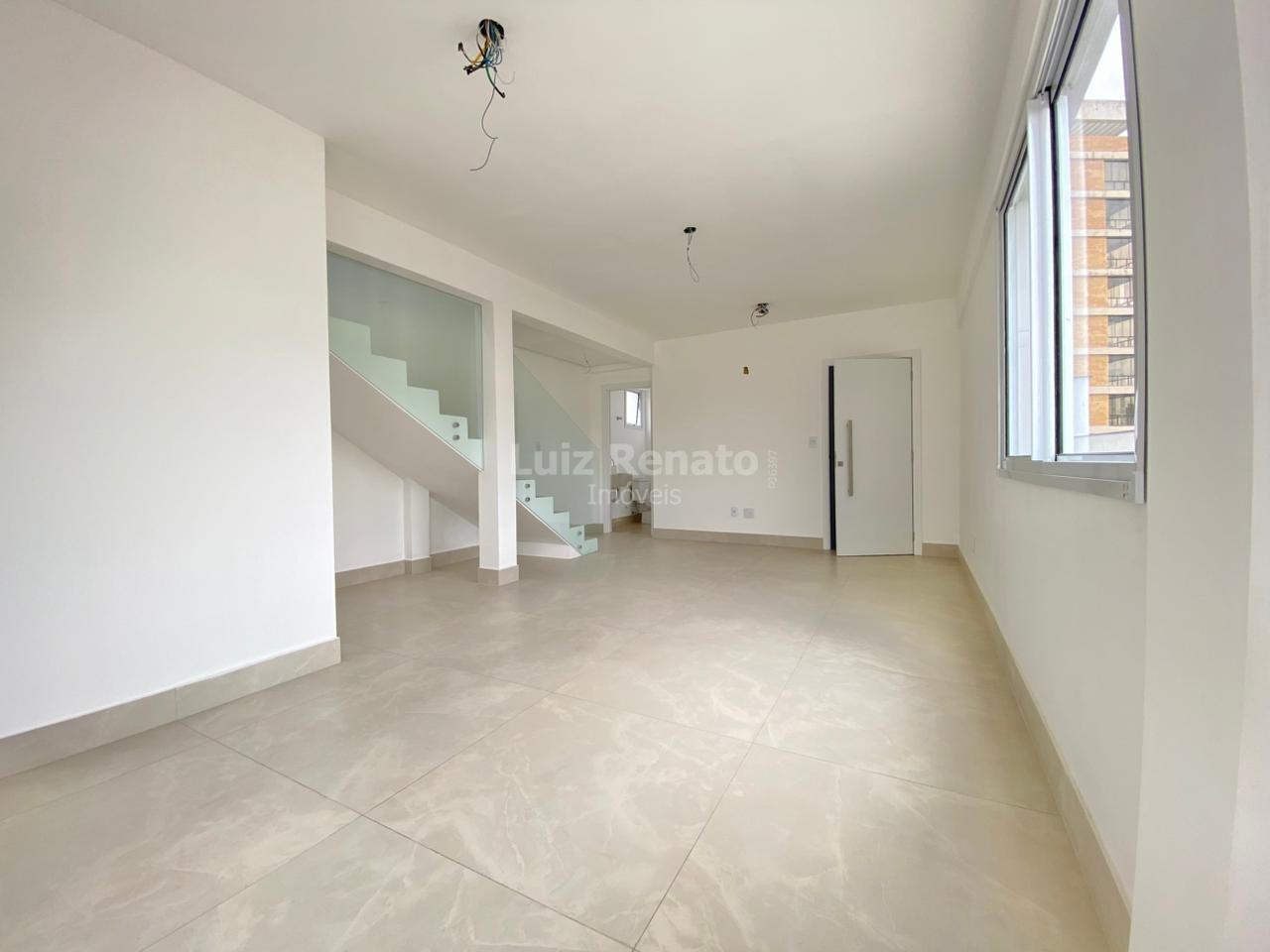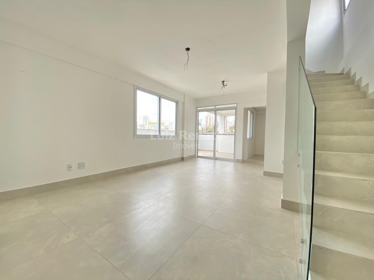 Cobertura top house sendo no primeiro pavimento uma sala para dois ambientes com piso em porcelanato e lavabo.